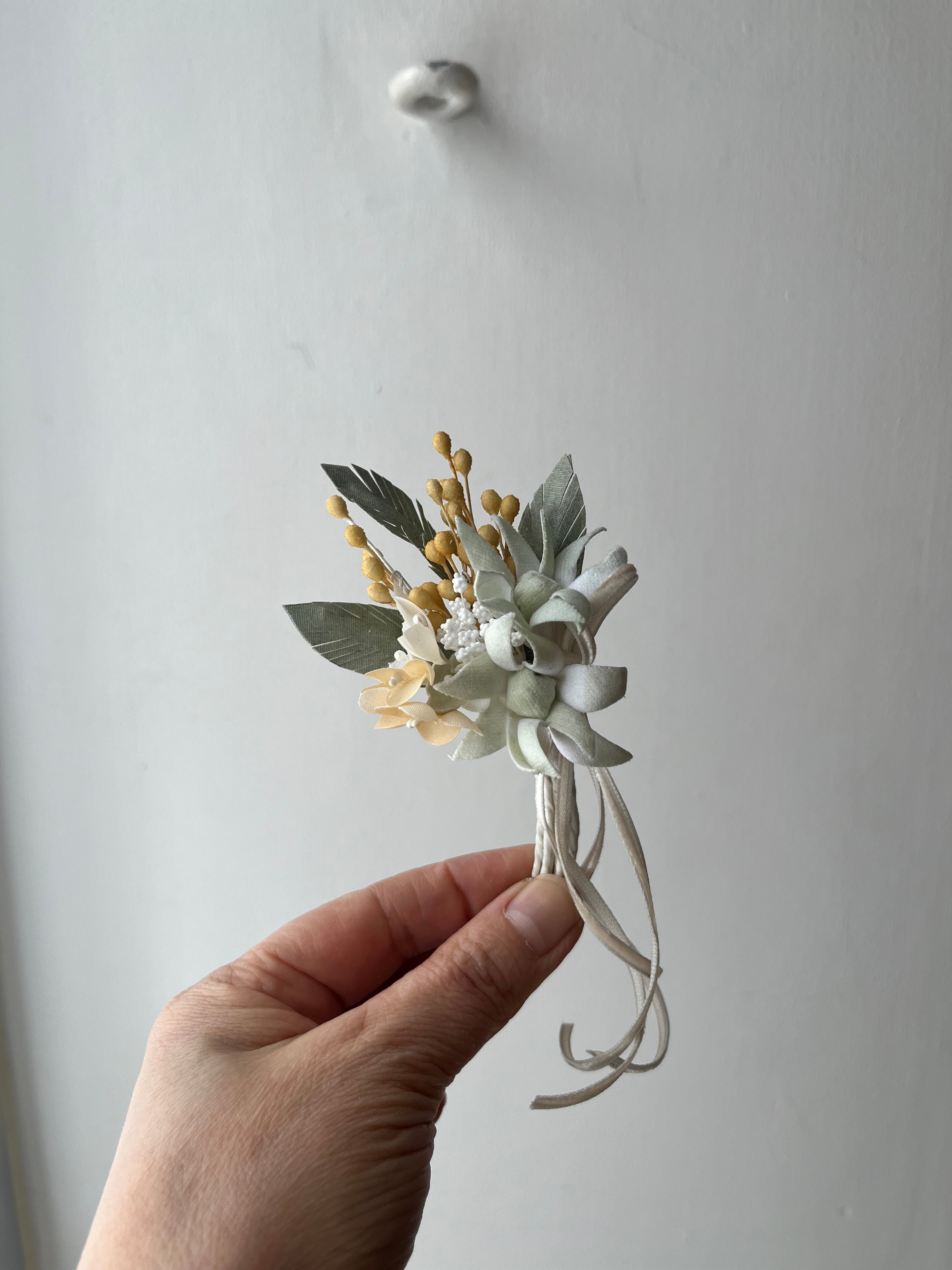 縦10cm 横5cm くらいの程よいサイズ。コサージュは軽やかで、さり気なくも華があります。お部屋に飾っていただいて見るだけで気分が上がります。
