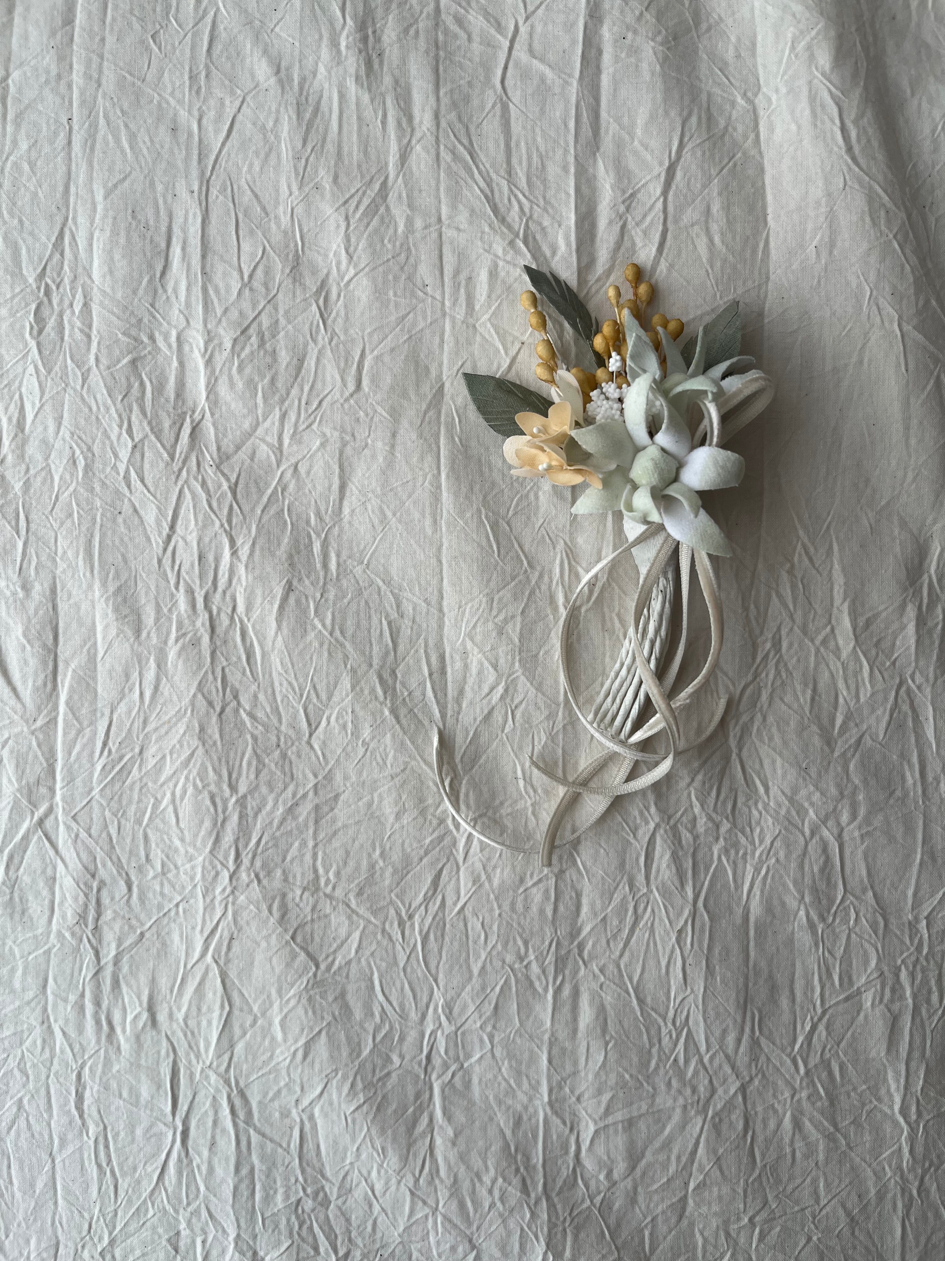 一輪一輪、布をカットし、染め、コテで仕上げた手作りのコサージュです。ミモザ黄色とフランネルフラワーの柔らかな白が調和して、卒入学式はもちろん、普段の装いにもぴったりです♪